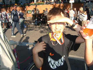 uns durch die Verpflegungsmeile schieben, tauschen E-Mailadressen aus