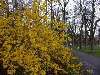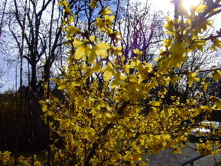 angesagtem Regen, scheint die Sonne auf die ersten blühenden Sträucher