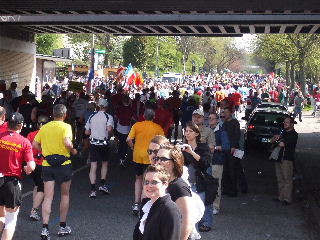 träge gen Starttor bewegende bunte Feld der Läuferköpfe. Das wird Staus