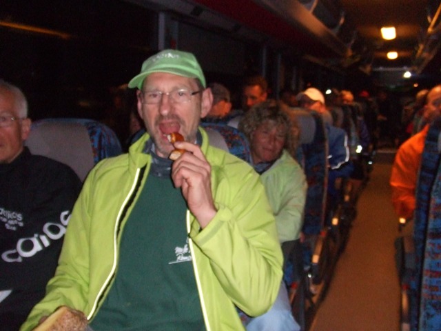 Im Morgenbus: der eine isst (Manfred), der andere schläft (Erwin).