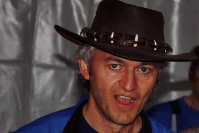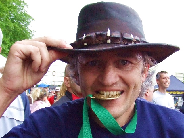Das Krokodil im Ziel. Mit Hut (sitzt er noch?) |