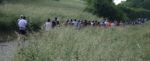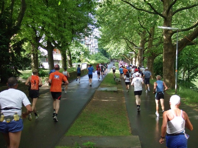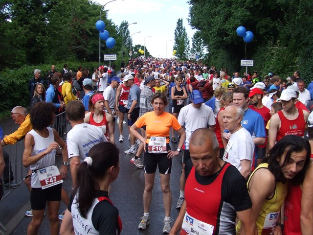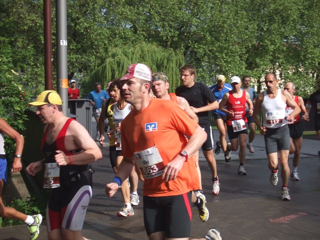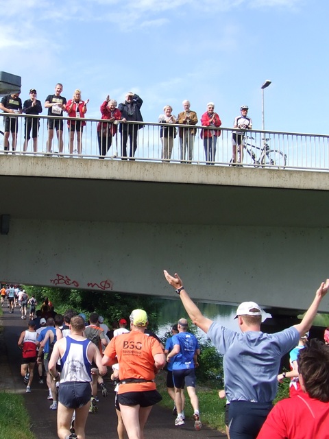 Km38: die Halbmarathonis stoßen zu uns. Ein Gewimmel, es wird