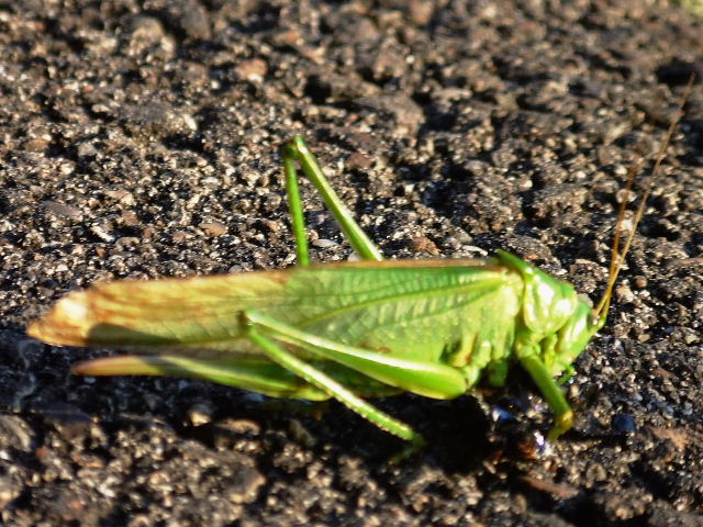 Heuschrecke lässt sich beim Futtern auf dem warmen Asphalt nicht