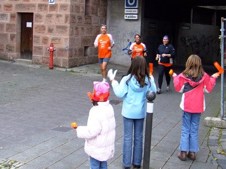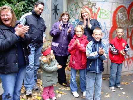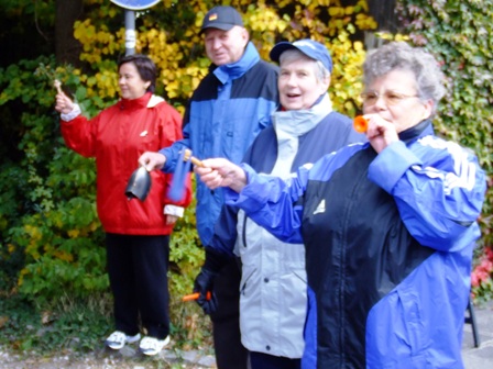 Km 4: Am Ende der Brücke der Fanblock mit Glocke (Danke, wie jedes