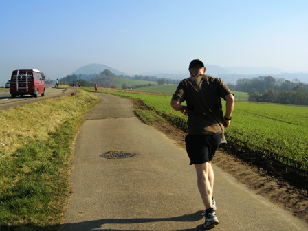 mich nach einem langen gerade Stück Weg um, bei etwa km28 und... Da läuft