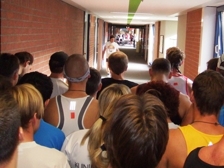 120 Marathonläufer sammeln sich im Korridor... |
